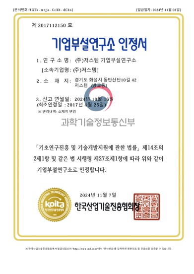기업부설연구소는 ㈜저스템의 보유기술 향상과 신기술 개발을 전담하는 부서입니다.